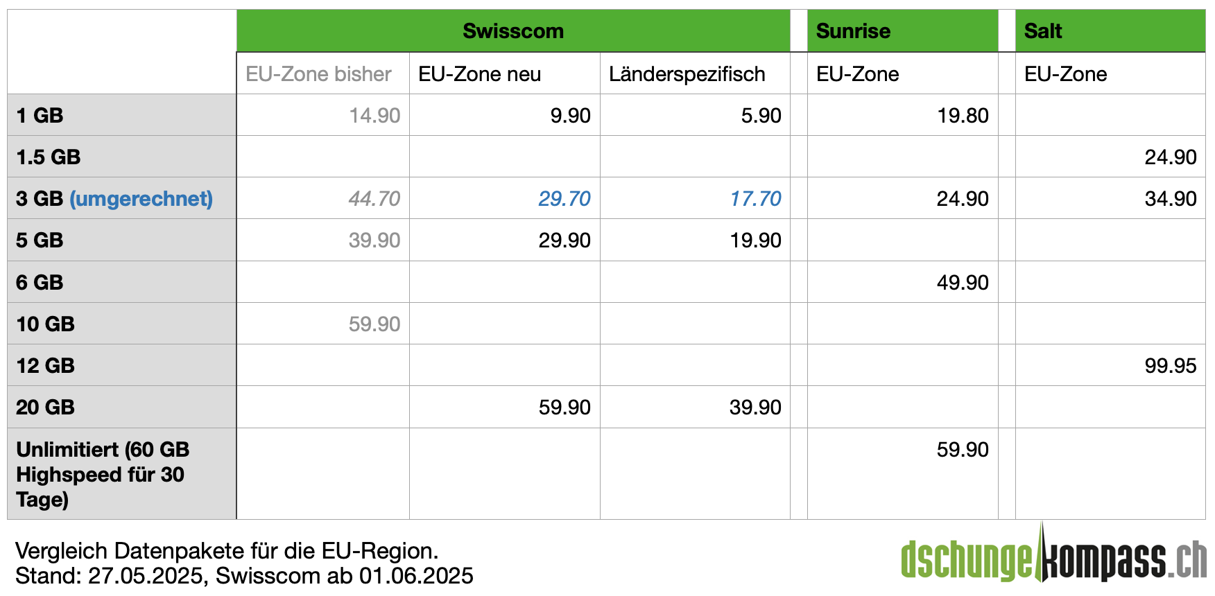 Ein Datenpaket mit 1 GB für die meisten europäischen Länder kostet bei der Swisscom heute CHF 14.90. Ab dem 1. Juni kostet es für alle Länder, die zur europäischen Zone gehören noch CHF 9.90. In einigen ausgewählten Ländern wird es noch günstiger. So kostet ein Gigabyte in Italien, Deutschland, Frankreich, Österreich, Spanien, USA, Kroatien und vielen weiteren Ländern noch CHF 5.90.