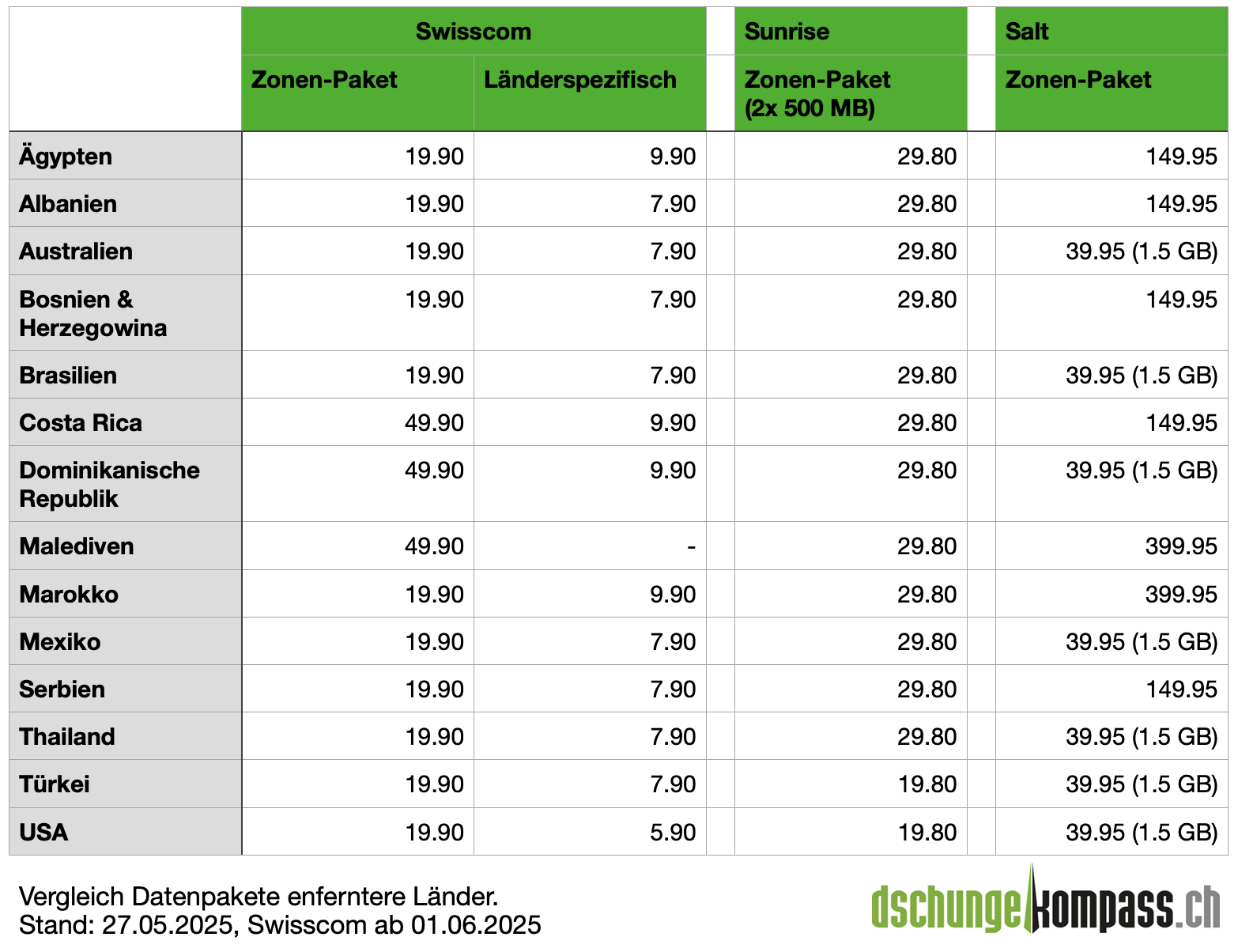 Da keine identische Paket-Grösse von allen Anbietern angeboten wird, wurden in der Tabelle die Kosten bei Swisscom für 3 GB umgerechnet. Ist für das Reiseland ein länderspezifisches Paket erhältlich, so verlangt Swisscom mit CHF 17.70 für 3 GB am wenigsten. Bei Sunrise kostet das Paket CHF 24.90 und bei Salt 34.90. Ist kein länderspezifisches Paket verfügbar, so liegt der Preis bei Swisscom mit CHF 29.70 ziemlich genau zwischen Salt und Sunrise.