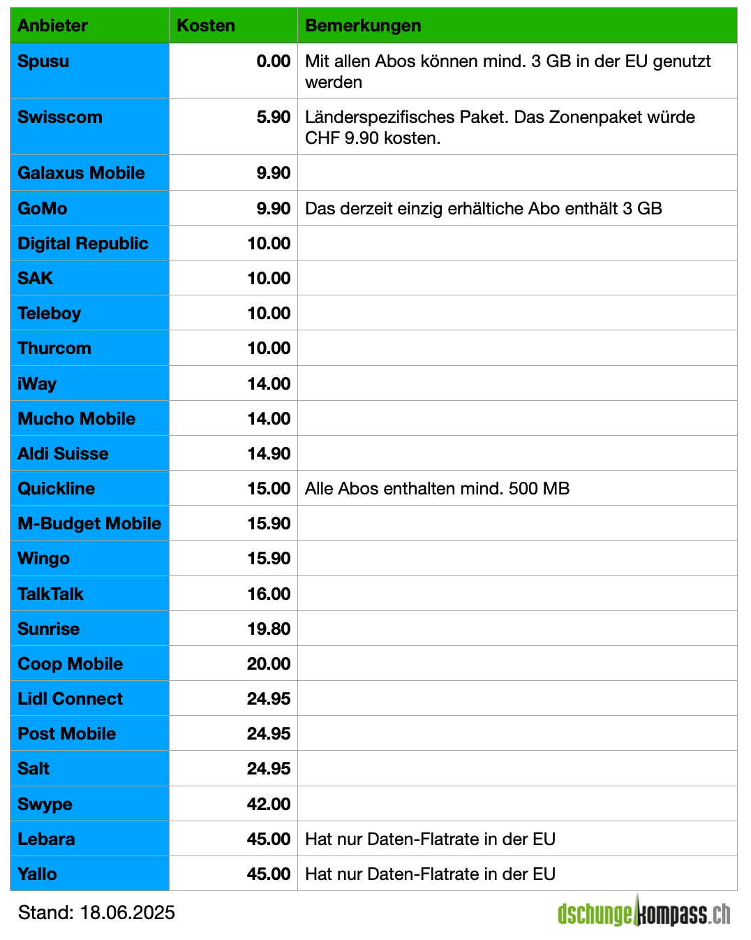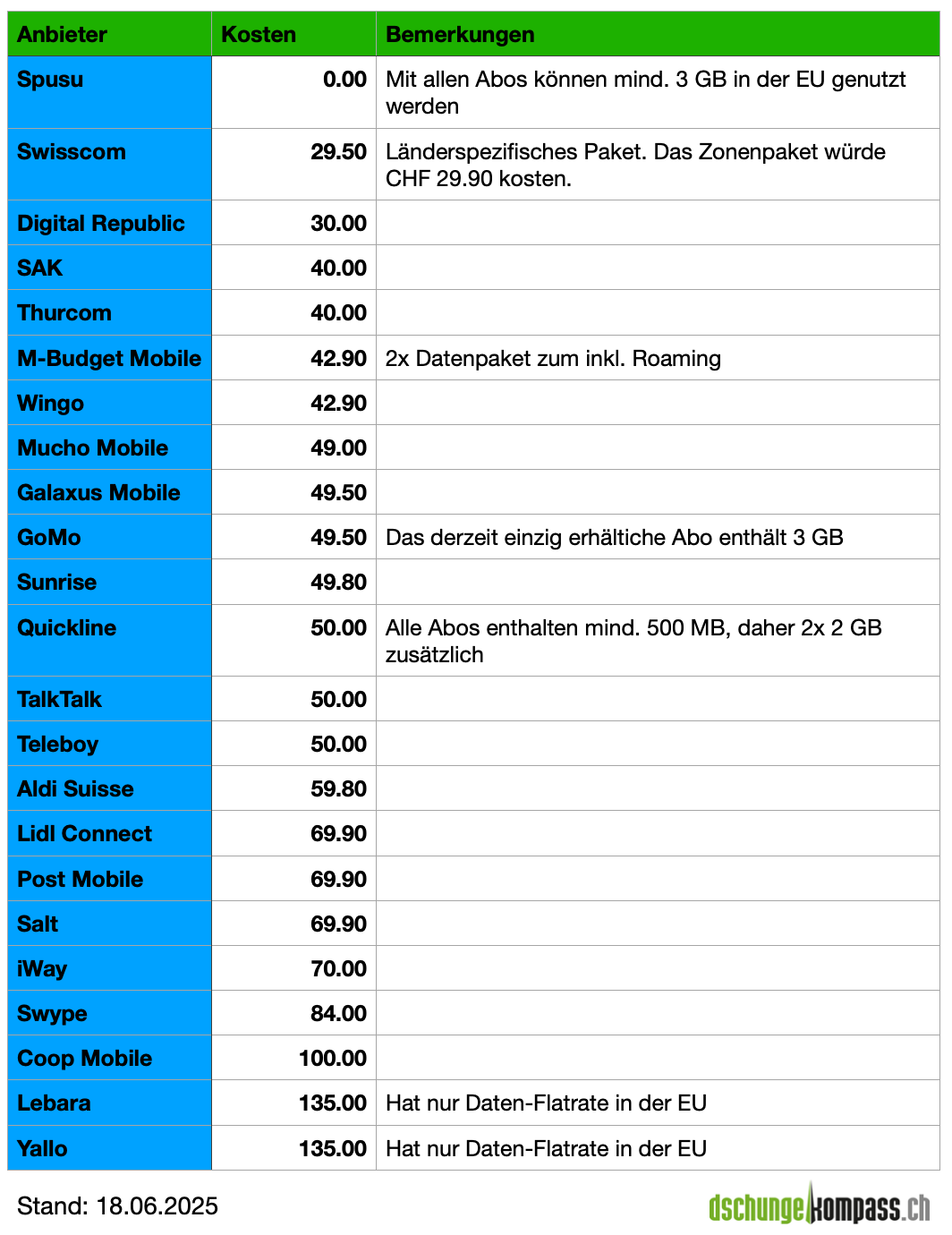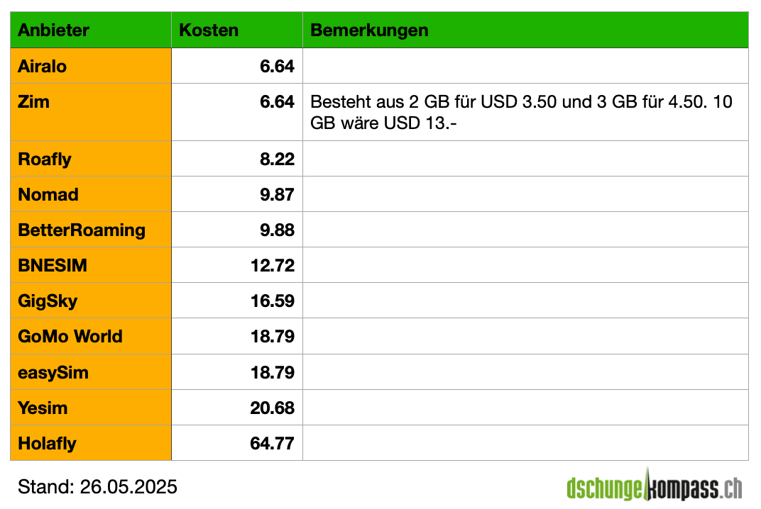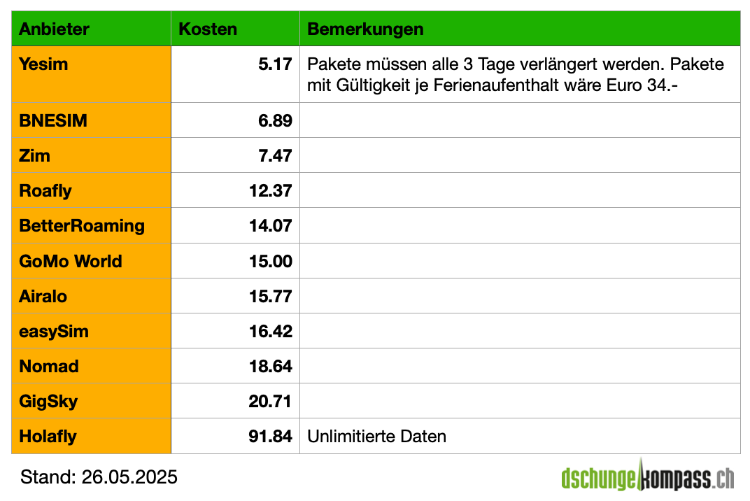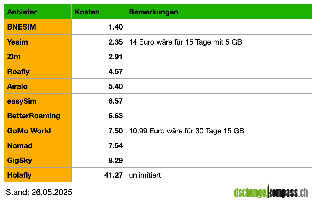 In der Kassensturz-Sendung von gestern, 17.05.2025, durfte Oliver Zadori von dschungelkompass bereits zum 13. Mal mitwirken. Untersucht wurden die Preisunterschiede für Roaming-Datenpakete der Schweizer Handy-Abo-Anbieter zu ausländischen eSIM-Anbietern. Die Preisunterschiede sind sehr gross.