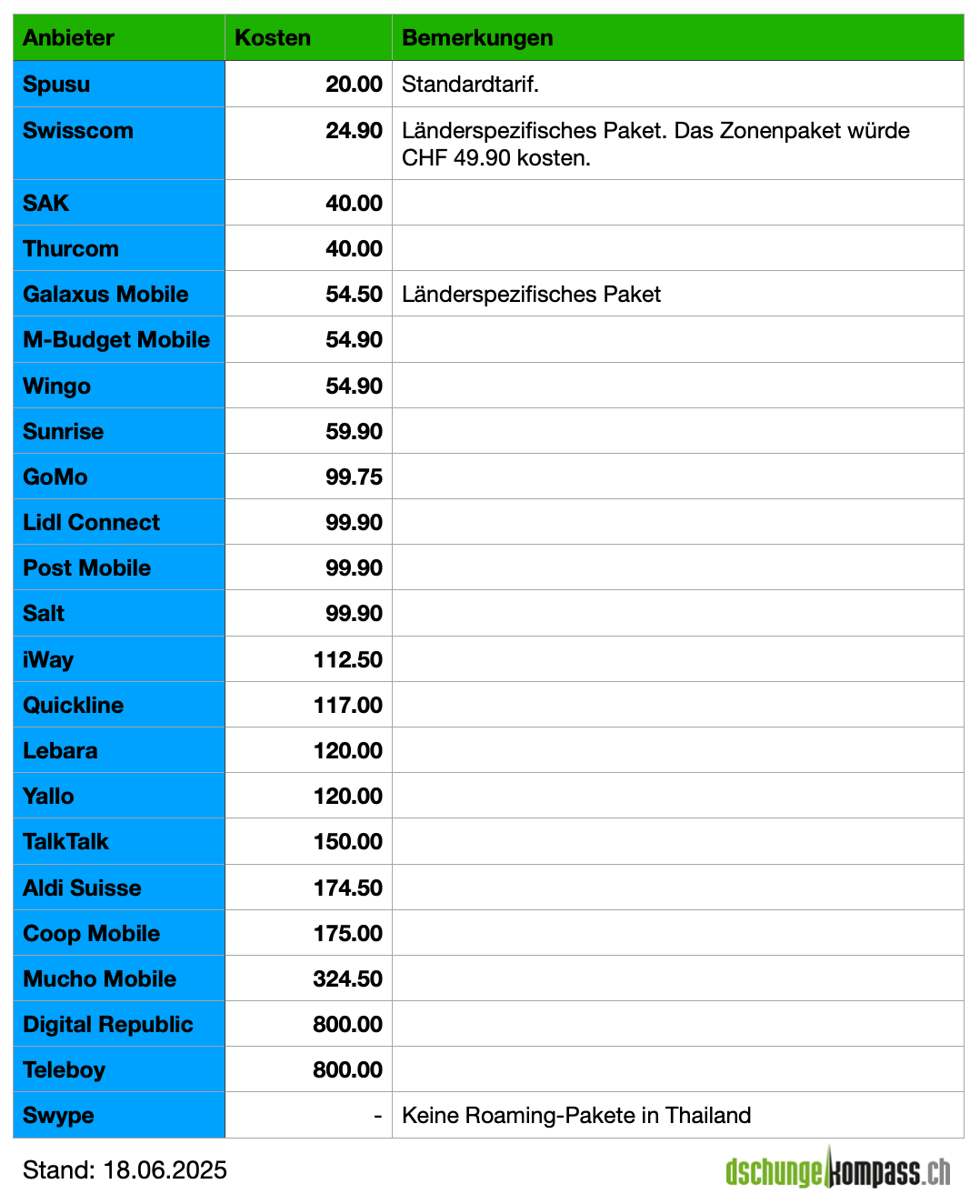 Für die Sendung wurde der Stichtag 26.05.2025 gewählt. Inzwischen haben Swisscom, Spusu, Thurcom und SAK bereits wieder Anpassungen gemacht, die sich auf den gezeigten Vergleich auswirken. Daher werden hier nochmals die Ergebnisse mit den Aktualisierungen gezeigt.